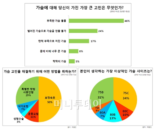 란제리 브랜드 '에블린'에서 11월 16일부터 22일까지 20대 여성 213명을 대상으로 '가슴에 대해 당신이 가진 가장 큰 고민은 무엇인가'라는 주제로 설문조사를 진행한 결과, 전체 응답자의 46%(99명)가 '체형에 비해 부족한 가슴 볼륨'을 꼽았다.