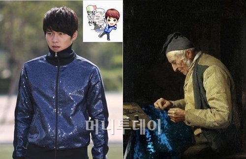 그림 속 할아버지는 현빈의 반짝이 트레이닝복과 같은 파란색 스팽글이 달린 천을 무릎에 올리고 한 땀 한 땀 정성스럽게 바느질을 하고 있다.