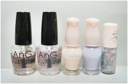 오늘 사용할 폴리쉬는 앙 베이스코트, 탑코트 기본! 에뛰드하우스 커피우유, 라일락우유, 실버글리터 예요~ 지브라 무늬 그릴 얇은붓도 준비해 주세요ㅎ (바바라 0호)