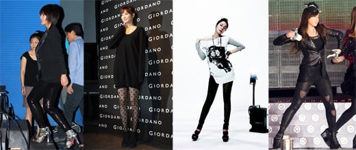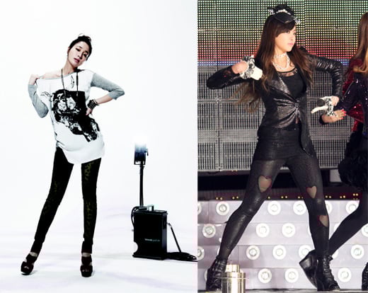 그룹 '에프엑스'의 빅토리아는 지난 SBS 가요대전에서 하트무늬 레깅스를 선보였다. 뱀피무늬에 하트구멍이 뚫린 레깅스는 빅토리아가 입은 언밸런스 재킷과 잘 어울렸다.