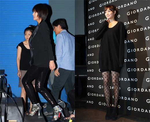 배우 하지원은 영화 '내 사랑 내 곁에'제작보고회 당시 블랙재킷과 독특한 '스팽글레깅스'를 신었다. 스팽글 레깅스는 시크한 블랙재킷과 매치하면 반짝반짝 포인트를 주기 좋은 아이템이지만 반짝임 때문에 자칫하면 다리가 굵어 보일 수 있는 아이템이다.
