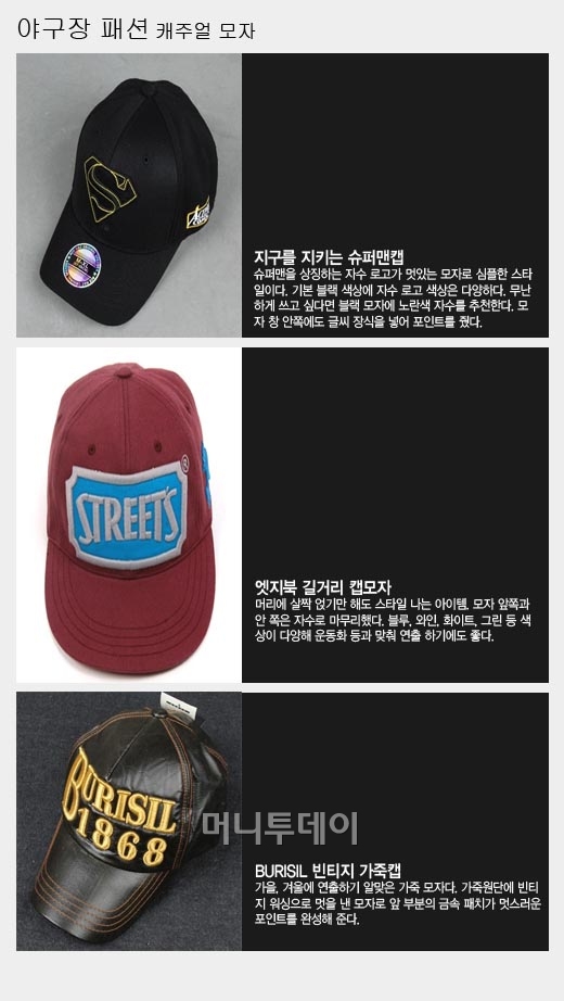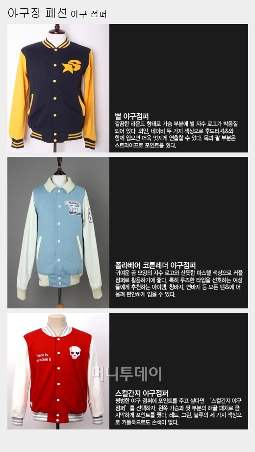 금주의 테마 : "야구장 패션" 2011 포스트 시즌이 시작 되면서 야구장은 응원 열기로 뜨거워지고 있다. 가을 나들이로 제격인 야구장에서 패셔니스타가 되는 방법은? 간단한 야구점퍼, 모자 등의 '캐주얼 룩'으로 야구장 멋쟁이가 될 수 있다. # 야구점퍼 # 캐주얼모자 # 스니커즈 제공=G마켓 독자들의 PICK! 윤미래, 뒤늦게 알려진 사망 소식..."긴 여행 떠나" 동서와 갈등→파혼 2번 아내..."조카는 남편 아이" 의심 충격 추성훈, '파격' 누드 화보 공개…"돈 안 받아, ♥야노 시호도 촬영" "남성 의사가 은밀한 곳 봤잖아" 이혼 선언…산부인과서 난동