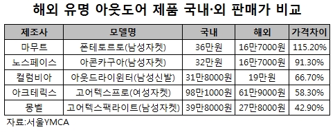 서울YMCA는 노스페이스, 콜롬비아, 아크테릭스, 마무트, 몽벨 등 5개사가 판매하는 기능성 아웃도어 제품 23종의 외국과 국내 공식 쇼핑몰 가격을 비교한 결과 국내 판매가격이 외국보다 최대 115.2%, 평균 56.6% 비싼 것으로 나타났다고 7일 밝혔다. 조사기간은 1월2일~2월3일이며, 해외 판매가격은 7일 기준환율을 적용했다.