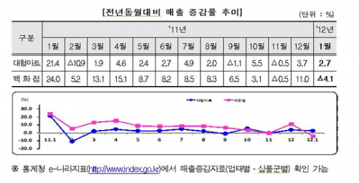 대형마트는 전반적으로 매출증가율이 둔화됐다. 지난해 1월 대형마트의 전년동월대비 매출증가율은 21.4%를, 전월은 3.7%를 기록했다.