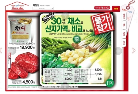 홈플러스는 전단지에서 해당 행사를 설명하면서 "일년내내 30여가지 채소를 산지가격과 비교해보세요"라고 광고하고 있다. 또 시금치와 청양고추 대파 풋고추 등의 채소가격을 나열하며 가격 하단에 '기준가'를 별도로 표기하고 있다.