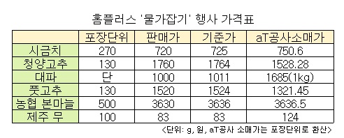 예를 들어 시금치(270g/봉/국내산)의 경우 홈플러스 판매가격을 720원으로 표기하고 그 아래에 '기준가'를 725원으로 제시하고 있는 식이다. 홈플러스는 이 기준가를 aT공사의 소매가격정보라고 설명하고 있다.