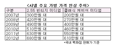 ◇5년만에 3배 뛴 가격…사두면 돈 번다고?=샤넬의 대표 제품인 '클래식 캐비어 미디엄'의 현재 가격은 612만원. 이 핸드백은 지난 2007년초 203만원에 판매됐던 제품으로 5년새 가격이 3배나 오른 셈이다. '2.55 빈티지 미디엄'의 가격은 2007년 300만원대에서 2012년 7월 현재 681만원으로 뛰었다. 샤넬이 지난 5년동안 가격을 8번이나 올리는 꾸준한 가격인상정책을 편 결과다.