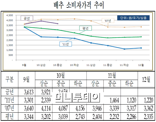 그렇다고 김장배추와 무의 공급이 원활한 것은 아니다. 재배면적 감소로 인해 생산량은 줄어들 것으로 예상되고 여기에 태풍 피해로 인해 김장배추와 무를 심는 시기가 늦어져 본격적으로 생산되는 시기도 김장철 시작에 맞추지 못하기 때문이다.
