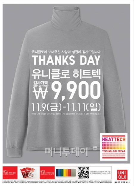 유니클로는 지난 9일부터 3일 일정으로 고객 감사 축제인 '유니클로 THANKS DAY' 할인 이벤트를 진행하고 있다.
