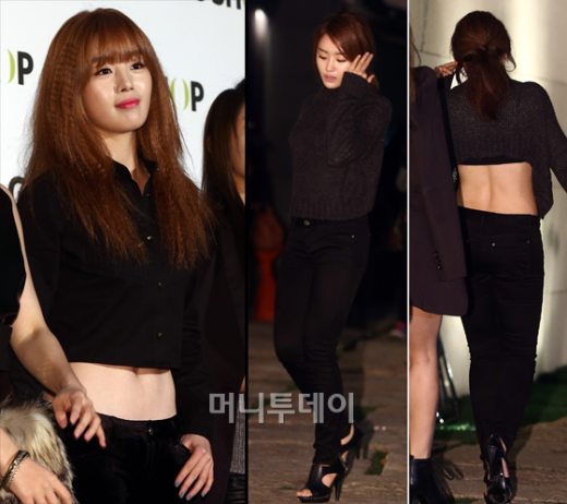 시크릿 멤버 한선화와 송지은은 '반전' 있는 '크롭탑' 의상을 선보였다. 두 사람이 착용한 의상은 얼핏 보면 평범해 보이지만 알고 보면 섹시한 '반전'이 있다. 크롭은 '잘라내다'라는 뜻으로 웨이스트라인이 짧은 상의를 일컫는다. 특히 앞뒤 길이가 다른 니트나 길이가 짧은 셔츠 등은 개성 있는 스타일로 대중들에게 꾸준한 인기를 끌고 있다. 한선화는 날씬한 허리라인이 그대로 드러나는 셔츠를 선택했다. 여기에 검은색 하의를 매치해 시크한 매력을 발산했다. 송지은은 섹시한 등이 보이는 니트로 매혹적인 스타일을 연출했다.