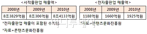 한편 한국콘텐츠진흥원에 따르면 국내 전자출판업 매출은 2008년 1188억원, 2009년 1660억원에서 2010년 1925억원으로 성장했다. 연 평균 27%에 달하는 성장 속도다. 그러나 전체 출판시장 규모 8조4000억원에 비하면 여전히 걸음마 수준에 불과하다.