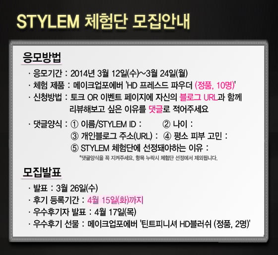 모집 기간은 이달 12일부터 24일까지 약 2주간이며 스타일엠 홈페이지 이벤트 게시판(http://stylem.mt.co.kr/event/eventView.html?tab=1&id=44) 또는 TALK-뷰티 이벤트 게시물(http://stylem.mt.co.kr/talk/talkView.html?no=223)에 양식에 맞는 댓글을 작성하면 응모할 수 있다. 합격자는 3월26일에 발표한다.