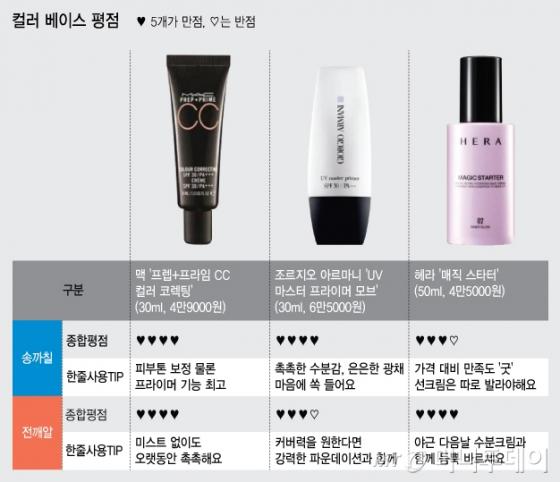 ▷전깨알='오키드' 컬러 사용. 세 가지 제품 중 제형이 가장 묽다. 쫀쫀한 감이 덜한 대신 수분감이 좋다. 가볍고 촉촉하게 피부 결을 정돈해 주고, 흡수도 빠르다. 커버력과 톤 보정력은 거의 없는 편이다. 라벤더 색상이지만 바르고 나면 무색에 가깝다. 단일 제품만 사용한 후엔 효과를 잘 모르겠는데 파운데이션을 덧바르면 은은하게 윤기가 돈다. 한 듯 안 한 듯한 투명 메이크업을 원하는 사람이 쓰기 적절한 제품. 기본적으로 잡티가 없고 피부가 좋은 사람에게 추천한다.