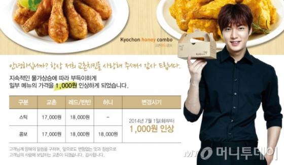 2일 외식업계에 따르면 교촌에프앤비(교촌치킨)는 이달부터 전국 900여개 전 매장에서 교촌 스틱·콤보 메뉴를 종전 1만6000원에서 1만7000원으로 1000원(6.25%) 올린다. 교촌레드/반반 스틱·콤보와 허니 콤보 메뉴도 1만7000원에서 1만8000원으로 1000원(5.88%)씩 인상한다. 교촌치킨 관계자는 "지속적인 물가 상승으로 부득이 하게 일부 메뉴 가격을 올리기로 했다"고 말했다.