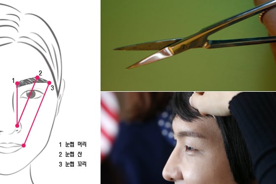눈썹 모양을 만들때는 눈썹 머리와 눈썹 산, 눈썹 꼬리의 위치를 먼저 잡아주는 것이 좋다. 콧망울에서 수직으로 선을 그어 이마 아래에서 만나는 부분이 눈썹 머리, 콧망울부터 눈동자를 지나는 직선의 끝 부분이 눈썹 산이다. 마지막으로 입꼬리와 눈꼬리를 지나는 끝 부분이 눈썹 꼬리다. 연필이나 젓가락 등 긴 막대를 이용하면 쉽게 찾을 수 있다.