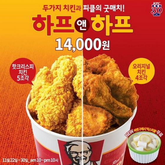 KFC는 오는 30일까지 두 가지 치킨을 한번에 즐길 수 있는 '하프앤하프' 버켓을 판매한다고 24일 밝혔다.