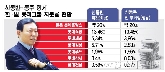 한국 롯데그룹의 주요 계열사 지분율도 엇비슷하다. 롯데쇼핑의 경우 신 회장 지분율은 13.46%, 신 전 부회장은 13.45%로 0.01%포인트 차이에 불과하다. 롯데푸드는 신 회장 형제가 각각 1.96%, 롯데상사는 신 회장과 신 전 부회장이 각각 8.4%, 8.03% 등 지분을 보유하고 있다.