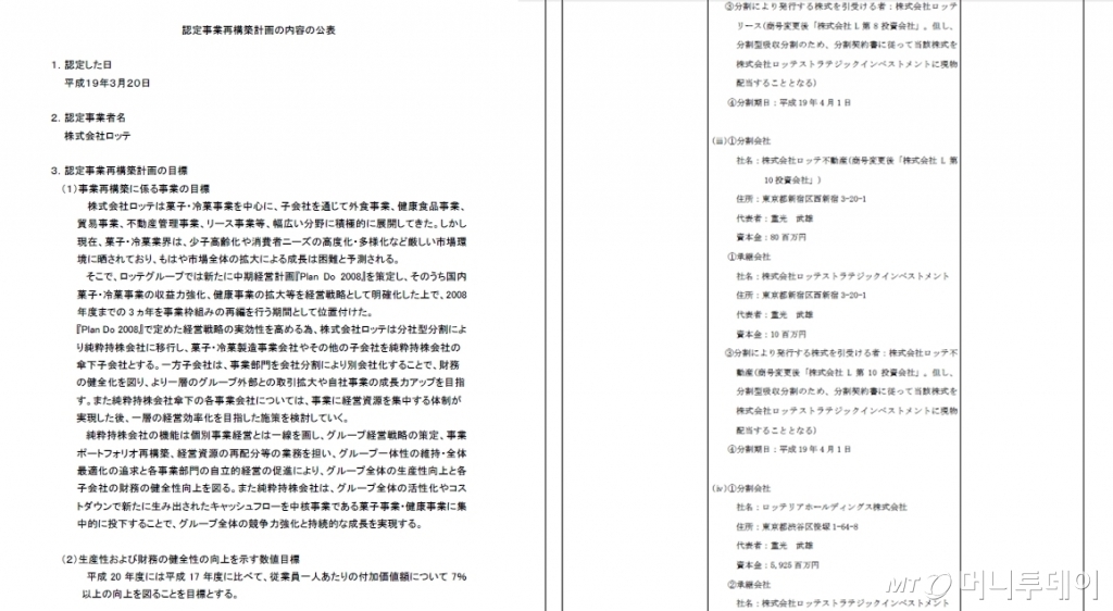 머니투데이가 7일 입수한 일본 롯데그룹의 지주사 전환계획인 'Plan Do 2008'에 따르면 일본 롯데는 2007년 3월20일 중기경영계획을 발표한다. 'Plan Do 2008'에서는 2008년부터 3개년에 걸쳐 60여 개가 넘는 계열사를 정리하고 구조를 단순화시키는 지주사 전환을 추진한다고 밝혔다.