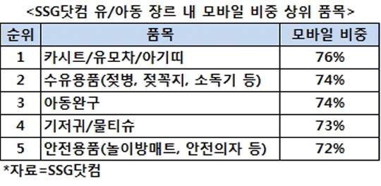 SSG닷컴에 따르면 모바일 매출 비중이 가장 높은 상품군은 유아동 분야로 전체 구매의 72%가 모바일앱을 통해 이뤄졌다. 이는 전체 평균 41%를 30%포인트 이상 웃도는 수준이다. 유아동 용품 중 카시트·유모차·아기띠가 76%로 모바일 비중이 가장 높았고 젖병, 젖병소독기 등의 수유용품(74%), 기저귀(73%) 등이 뒤를 이었다.