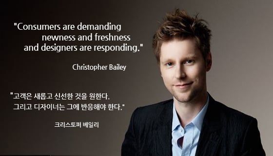 "고객은 새롭고 신선한 것을 원한다. 그리고 디자이너는 그에 반응해야 한다."조급해하지 않고 서서히 내실을 다지며 상승하던 버버리는 지난해 사상 최대인 2500억원대 매출을 기록하며 현재까지 순항중이다. 기술과 문화까지 모든 것이 빠르게 발전하고 있는 사회 흐름에 유연하게 대응한 크리스토버 베일리의 선택은 옳았다. 그와 함께 '안티에이징'에 성공한 버버리는 패션계의 '웰에이징'을 시작하고 있다.