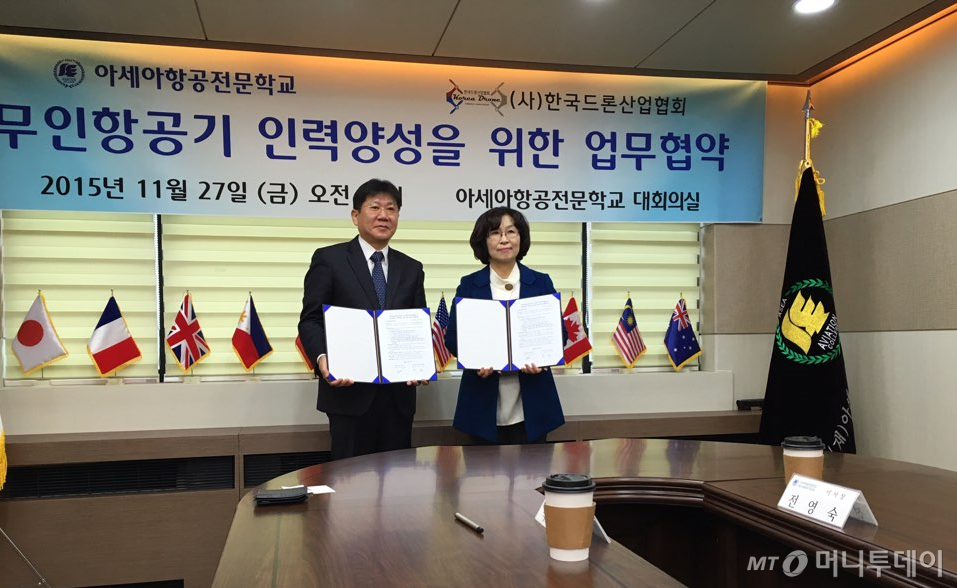 한국드론산업협회(회장 박석종)와 아세아항공직업전문학교(이사장 전영숙)는 서울 용산구 원효로에 위치한 아세아항공직업전문학교에서 드론 전문인력양성 등을 위한 MOU(양해각서)를 27일 체결했다.