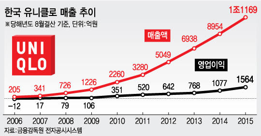 30일 금융감독원에 따르면 유니클로 한국 법인인 에프알엘코리아의 8월 회계연도마감(2014년 9월∼2015년 8월) 기준 매출액은 1조1169억원으로 전년 대비 24.7% 증가했다. 영업이익은 전년 대비 45.2% 늘어난 1564억원, 당기순이익은 46.8% 늘어난 1194억원을 기록했다.