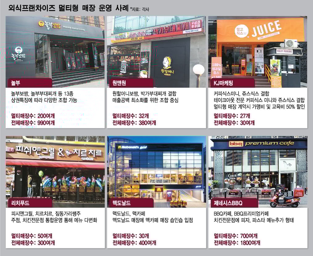 원할머니보쌈과 박가부대찌개를 운영하는 원앤원도 2개 브랜드를 통합한 복합매장을 선보였다. 전국 380개 매장 가운데 32곳에서 보쌈과 부대찌개를 함께 판매하고 있다. 리치푸드는 지난 5월부터 주점 프랜차이즈인 '피쉬앤그릴'과 치킨 프랜차이즈 '치르치르'를 숍인숍 방식으로 합친 멀티형 매장을 선보이고 있다.