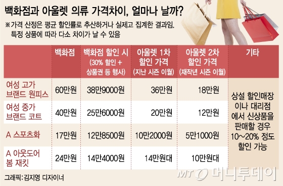 한 브랜드 관계자는 "아울렛 제품이 저렴해 보일 수 있지만 백화점에서 최대 30%까지 할인행사를 하는 경우가 많고 백화점 카드 할인과 상품권 행사까지 합하면 40% 할인과 비슷한 가격이 나오기도 한다"며 "신상품을 제 시즌에 입을 수 있기 때문에 감가상각까지 고려하면 더 합리적으로 소비할 수도 있다"고 밝혔다.