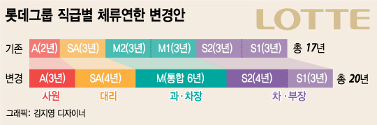 롯데그룹은 사원과 대리에 해당하는 직급 연한을 각각 3년과 4년으로 1년씩 늘리고, 차·부장(S2) 연한을 1년 늘려 체류연한을 총 20년으로 연장키로 했다. M2와 M1은 M(과·차장)직급 하나로 통합해 중간 승진 단계를 하나 생략하고 최소 6년의 직급 연한을 부여키로 했다.
