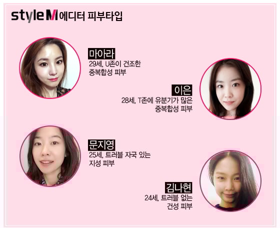 마아라=매끈한 글로우 피부표현에 심취해 모공을 세심하게 커버하는 매트한 파운데이션을 즐겨 사용한다. U존이 건조한 편이지만 화장이 지워질까 두려워 미스트를 잘 사용하지 않는다.