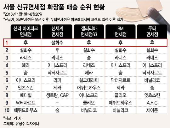 이 같은 흐름은 면세점 업계 투톱인 롯데, 신라에서도 크게 다르지 않았다. 루이비통, 샤넬 등 명품 브랜드가 입점한 두 면세점에서도 후와 설화수가 지난해 전체 매출 1, 2위를 차지했고 헤라, 라네즈, 이니스프리 등 토종 브랜드가 10위 내에 들었다.