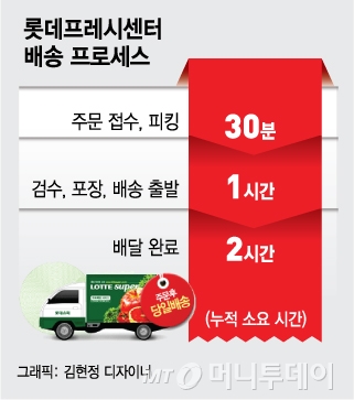 프레시센터 배송은 오전 10시와 오후 1시, 3시, 5시, 7시 등 다섯 차례가 진행돼 사실상 '실시간 배송'에 가깝다. 해가 긴 여름철에는 오후 8시30분에 배송을 추가해 모두 여섯 차례 배송한다. 주문 후 배송에 걸리는 시간은 2~3시간으로 쿠팡 '로켓배송'이나 이마트 '쓱 배송'보다 더 빠르다는 평가다.