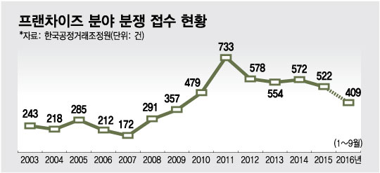 9일 한국공정거래조정원에 따르면 9월 말 현재 접수된 프랜차이즈 가맹사업 관련 분쟁은 총 409건이다. 이는 전년동기대비 11% 증가한 수치다. 2003년부터 2007년까지 연평균 180건~260건이던 분쟁접수 건수는 2011년 733건으로 정점을 찍었다. 2012년부터는 550~570건 수준을 유지하고 있다.