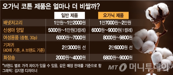 유아용 기저귀를 둘러보다 오가닉코튼 제품을 고른 박모씨(28·여)는 "오가닉코튼이 더 비싸긴 하지만 왠지 아이에게 더 좋을 거 같은 느낌이 들어 구매한다"며 "큰 차이가 보이는 것은 아니지만 아이에게 좋은 것을 해주겠다는 생각에서 사는 것"이라고 했다.