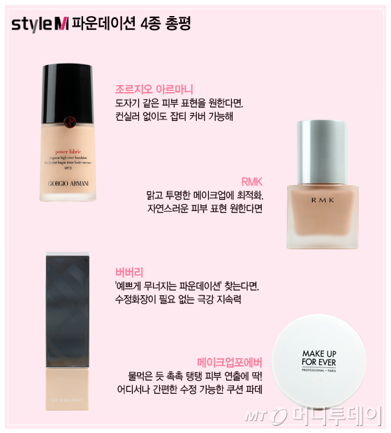 스타일M 에디터들은 올봄 화사한 세미 매트 피부를 완성하는 파운데이션 4종을 한달간 사용해봤다. △조르지오 아르마니 △RMK(알엠케이) △버버리 △메이크업포에버의 신상 파운데이션을 직접 써보고 느낀 후기를 소개한다.