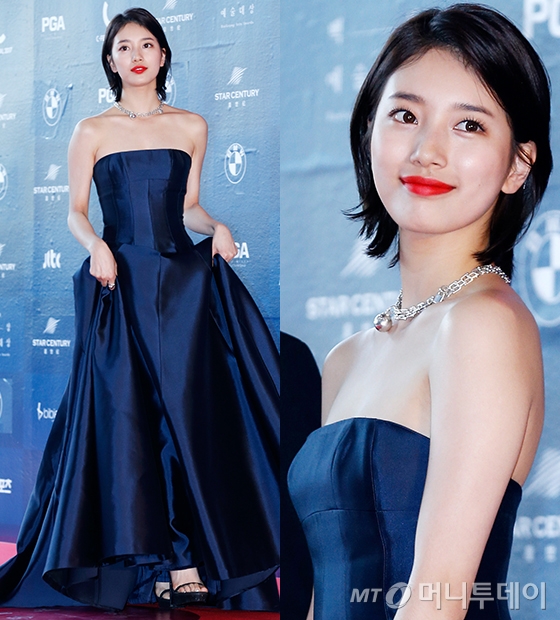 단발머리로 헤어스타일을 변신한 이후 첫 공식석상에 등장한 수지는 여전한 미모를 자랑해 놀라움을 자아냈다. 수지는 오렌지 레드 컬러 풀 립 메이크업을 연출해 우아한 매력을 발산했다.