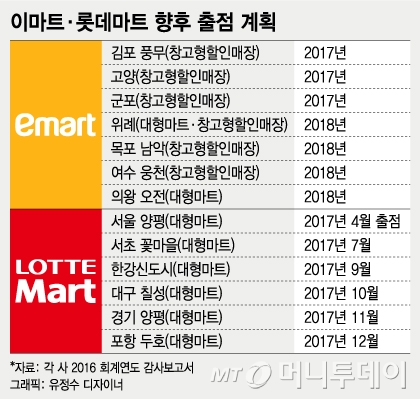 업계 1위인 이마트는 당분간 창고형할인매장인 이트레이더스에 집중한다. 올해 대형마트를 한곳도 출점하지 않는 대신 김포 풍무, 고양, 군포 등 3곳에 이트레이더스를 오픈한다. 내년 출점 계획도 이트레이더스가 3곳(위례, 목포 남악, 여수 웅천)으로, 대형마트(위례, 의왕 오전) 2곳 보다 많다. 계획대로 출점이 모두 이뤄지면 이트레이더스점은 현재 11개점에서 2018년엔 17개점으로 늘어나게 된다.