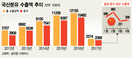 그러나 3월 들어 중국의 사드 보복조치가 전방위로 확산되면서 국산 분유도 타격을 입었다. 3~4월 국산분유의 중국 수출액은 529만 달러로, 전년 동기 대비 60% 이상 급감했다. 이에 전체 수출액도 같은 기간 742만 달러로, 55% 축소됐다. 현 상태가 이어질 것으로 가정할 경우 연간 수출액은 약 7800만 달러로, 2013년 수준으로 회귀한다.