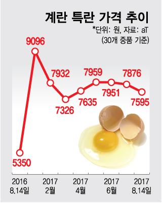 현재 계란값은 AI 여파로 올해 1월 9000원을 넘기도 했던 것과 견줘서는 낮아졌지만 이후 반년 이상 7000원대 가격이 유지되고 있다. 지난해 계란 연평균 가격이 5492원에 그쳤던 것과 견줘 1500원이상 비싸다.