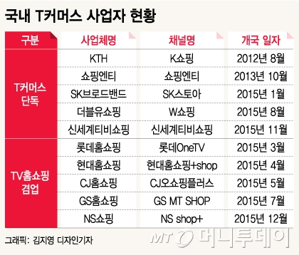 현재 국내에는 T커머스 전문업체 5곳과 TV홈쇼핑 겸영사 5개를 포함해 T커머스 업체 10곳이 운영 중이다.