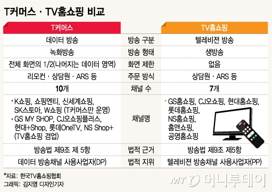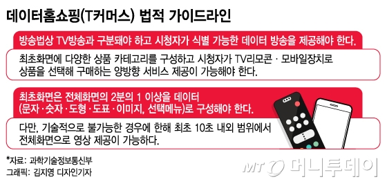 송출 경로 말고도 T커머스 화면 비율이 전체 화면의 절반을 넘지 않아야 한다거나 생방송이 불가하다는 점도 TV홈쇼핑과 구분되는 T커머스 규제다. T커머스 방송은 홈쇼핑과 달리 100% 녹화 방송이다. 또 화면의 절반을 문자·숫자·선택메뉴 등 데이터로 구성해야 한다.