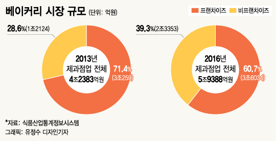 2013년 71.4%였던 제과·제빵 프랜차이즈 비중은 2016년 60.7%로 10.7%p 줄었다. 반면 비프랜차이즈 전문점 비중은 같은 기간 28.6%에서 2016년 39.3%로 10.7%p 증가했다. 매출 규모도 2013년 1조 2124억 원에서 2016년 2조 3353억 원으로 92.6% 껑충 뛰었다.