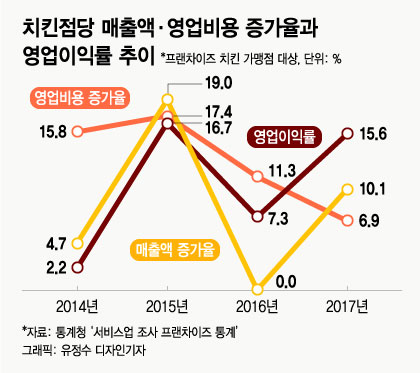 통계청의 프랜차이즈와 비프랜차이즈 가맹점간 비교자료에 의하면 2017년 업체당 매출액은 프랜차이즈 가맹점이 비가맹점보다 많으나 영업비용도 크게 증가해 결국 영업이익률은 가맹점(5.7%)이 비가맹점(9.8%)보다 크게 낮았다.