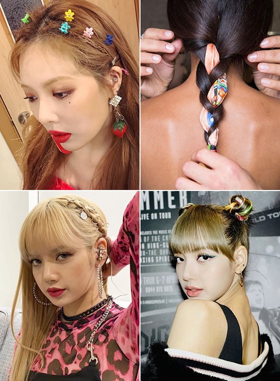 현아는 땋은 머리 주변으로 알록달록한 색감의 미니 집게핀을 꽂아 포인트를 더했으며, 리사는 땋은 머리 가닥 위에 가느다란 링 장식을 달아 독특한 스타일을 연출했다.