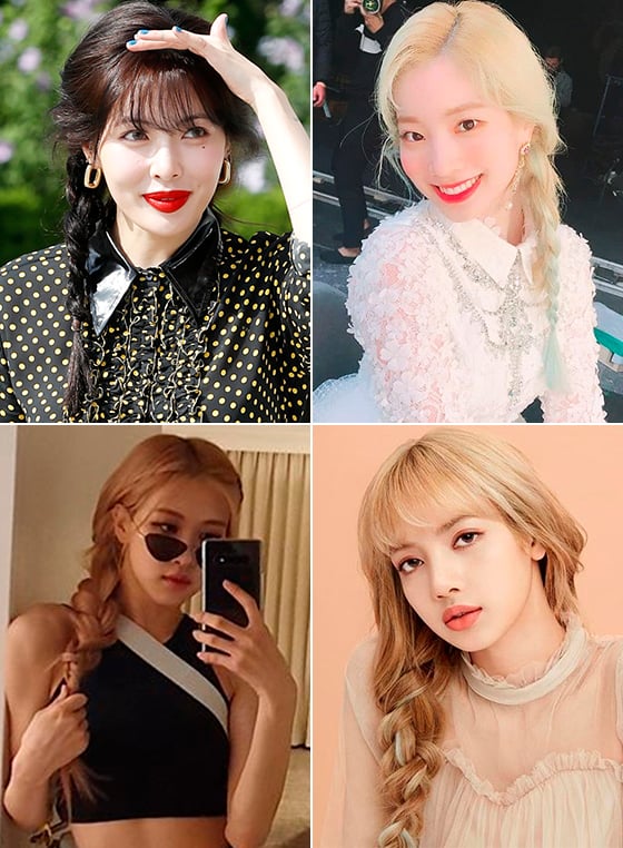 가수 현아, 그룹 트와이스 다현과 블랙핑크 리사는 사랑스러운 시폰 드레스와 함께 한쪽으로 넘긴 브레이드 헤어스타일을 연출했다.