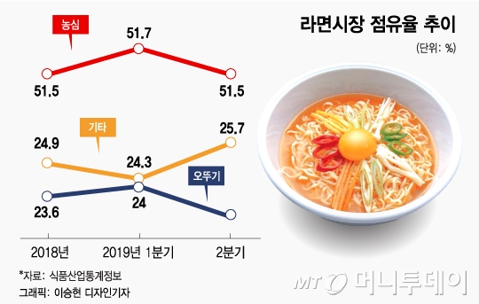 4일 식품산업통계정보시스템에 따르면 지난 2분기 오뚜기 라면의 소매판매 매출은 1181억원으로 전년동기 대비 4% 감소했다. 라면 시장 내 점유율도 22.8%로 0.4%p 떨어졌다. 진라면 점유율이 높아지고 신제품 쇠고기미역국라면이 대성공을 거뒀던 지난해 4분기 25.6%까지 점유율을 확대했던 것에 비해서는 2.8%p 낮아진 셈. 반면 라면업계 1위인 농심 점유율은 지난해 2분기 50.4%에서 51.5%(2019년 2분기)로 회복세를 보이고 있다.