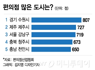전국에서 편의점이 가장 많은 지역은 경기 수원시로 807개였다. 다음으로 제주시가 727개, 서울 강남구가 719개 순이었다. 충북 청주시가 673개, 충남 천안시 650개, 경남 창원시가 628개로 뒤를 이었다.
