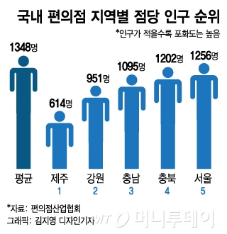 국내 편의점의 50.6%는 수도권에 분포하는 것으로 파악됐다. 서울은 편의점당 인구수가 1256명으로 전국평균(1348명)보다 더 포화상태로 파악됐다. 전국적으로는 제주가 614명, 강원이 951명으로 과포화 지역으로 꼽혔다. 그러나 이 지역은 관광지라는 특수성으로 유동인구를 고려해야한다는 설명이다. 이를 제외하면 충청지역이 충남 1095명, 충북 1202명으로 서울보다 포화도가 높았다. 반면 세종은 2151명, 대전은 1490명으로 상대적으로 낮았으며, 호남과 영남지역도 평균보다 점포당 인구수가 많았다.