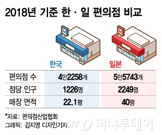 협회 회원사 기준 편의점 1개당 인구수는 1348명이었다. 여기에 이마트24를 포함하면 1226명으로 더 줄어든다. 일본의 경우 2249명당 1개꼴이어서 2배 가까이 더 밀집해있는 것이다. 다만 일본은 40평대 대형매장이 많은 반면 한국은 22평 수준 소규모 점포 출점이 많아 직접비교가 어렵다는 평가도 있다.