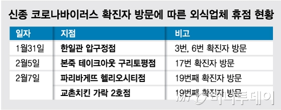 확산에 대한 우려가 커지면서 최근 들어서는 확진자 동선에 포함된 식당, 매장 들은 즉시 영업을 중단하고 방역에 나서고 있다. 지난 5일 확진판정을 받은 19번 환자가 다녀간 서울 송파구 소재 파리바게뜨와 교촌치킨은 6일 보건당국으로부터 통보를 받은 즉시 영업을 중단했다.